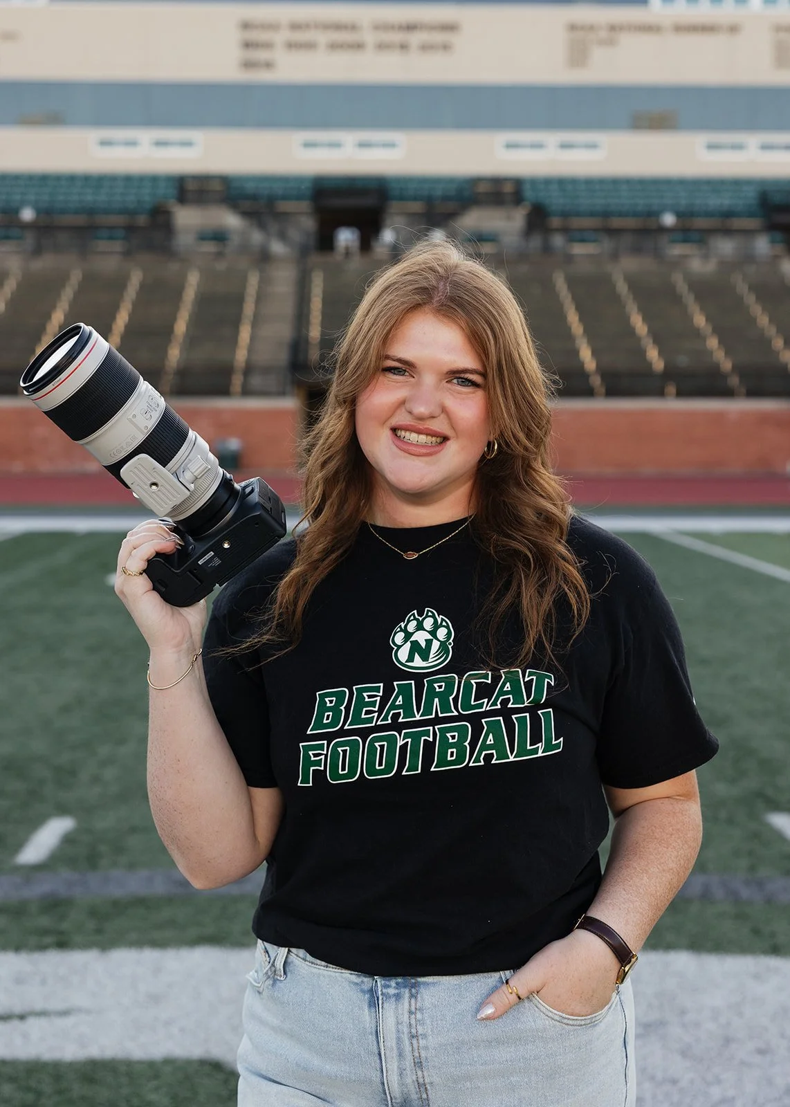 As a Creative Media member for Bearcat Football, I love being able to merge my love for the program with my skills in creativity, collaboration, and organization. This role offers a unique opportunity to contribute to a team that has given me so much joy, while working in a dynamic, fast-paced environment. I’ve been able to organize and lead weekly jersey photoshoots as well as photograph game days. I’ve also taken part in planning out weekly TikToks that allow viewers to see a different side of the players.